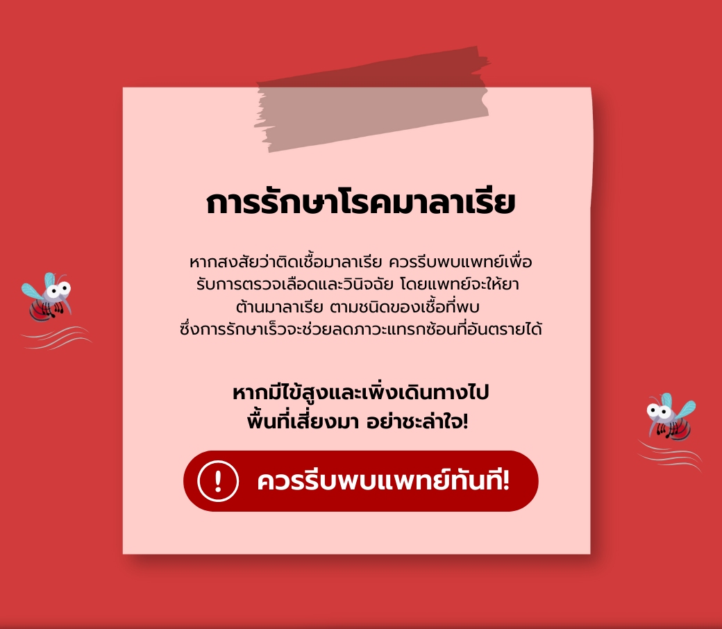 หากสงสัยว่าติดเชื้อมาลาเรีย ควรรีบพบแพทย์เพื่อรับการตรวจเลือดและวินิจฉัย โดยแพทย์จะให้ยา ต้านมาลาเรีย ตามชนิดของเชื้อที่พบ ซึ่งการรักษาเร็วจะช่วยลดภาวะแทรกซ้อนที่อันตรายได้ หากมีไข้สูงและเพิ่งเดินทางไปพื้นที่เสี่ยงมา อย่าชะล่าใจ ควรรีบพบแพทย์เพื่อตรวจหาเชื้อมาลาเรียทันที